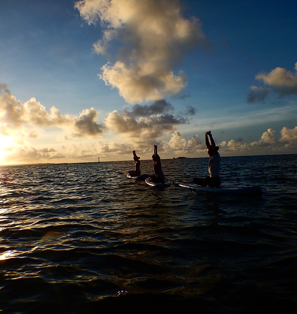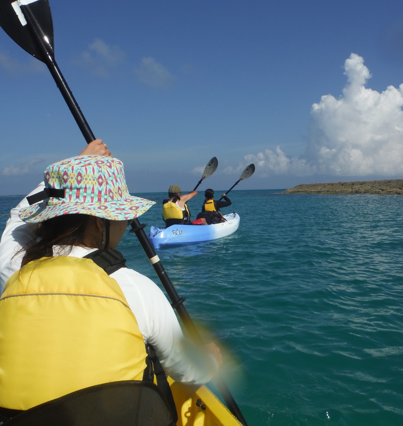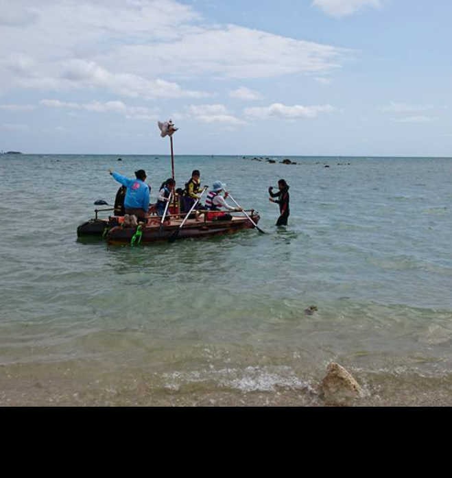 目の前の海へ小船(サップ)を2名でにのり、伝説の海に出ます。魚や貝のランチ