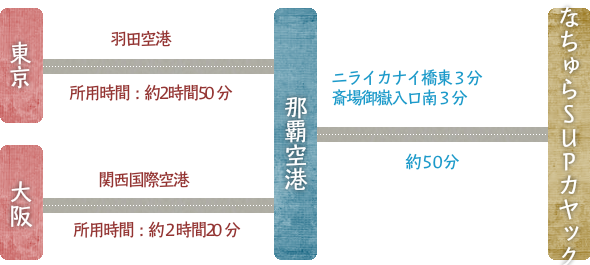 国道331号を南下して約10分の豊見城・名嘉地ICから豊見城東道路に入り(南風原南ICで降りる)、県道82号~県道86号~国道331号へと進むルートが速い。途中、垣花交差点を左折して約4キロ走るとニライ橋カナイ橋だ。国道331号との合流点、吉冨交差点まで続く1キロほどの曲がりくねった橋は沖縄屈指のビューポイント。吉冨交差点を左折すると800メートルほどで斎場御嶽への入口があり向かいに久高そば屋さんを海側に坂を下ります。